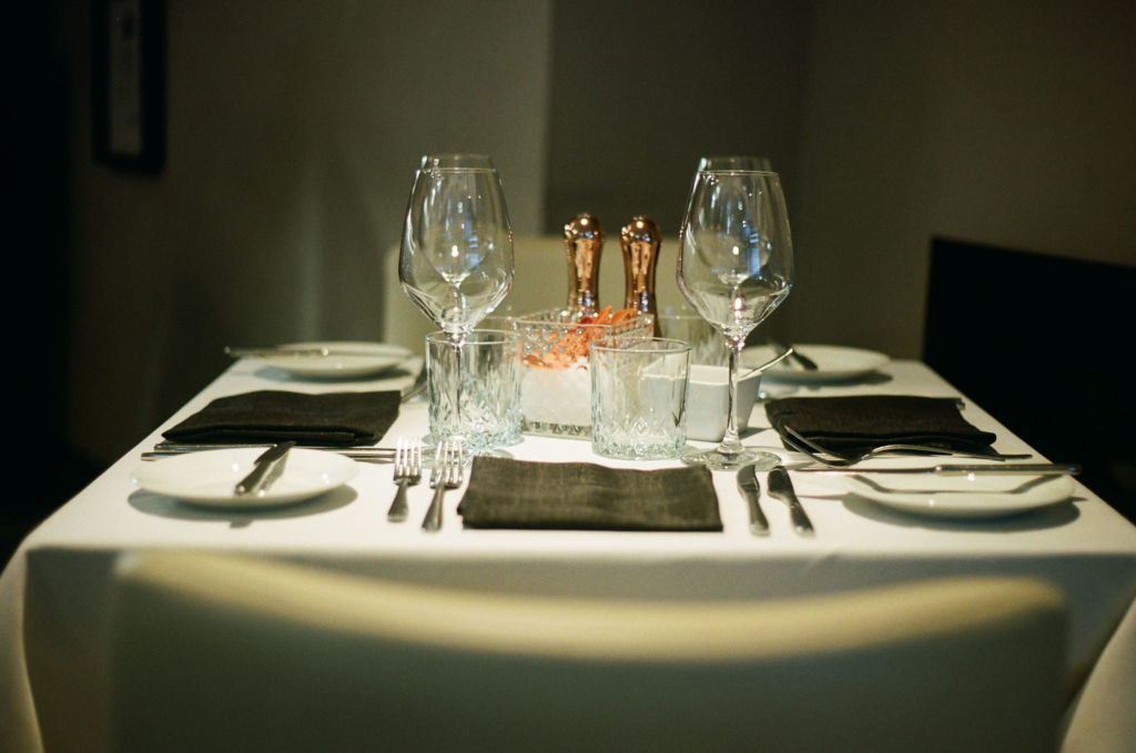 La table présente une atmosphère intimiste et contemporaine. L’éclairage tamisé crée un cadre presque cinématographique, idéal pour un dîner en tête-à-tête. L’ensemble évoque un restaurant haut de gamme ou une table soigneusement pensée pour une soirée élégante.