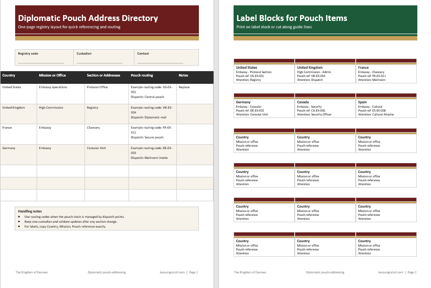 Download the Word & PDF templates and deploy a clean, registry-style diplomatic pouch address system—ready to print, easy to update, and built for operational precision 📩