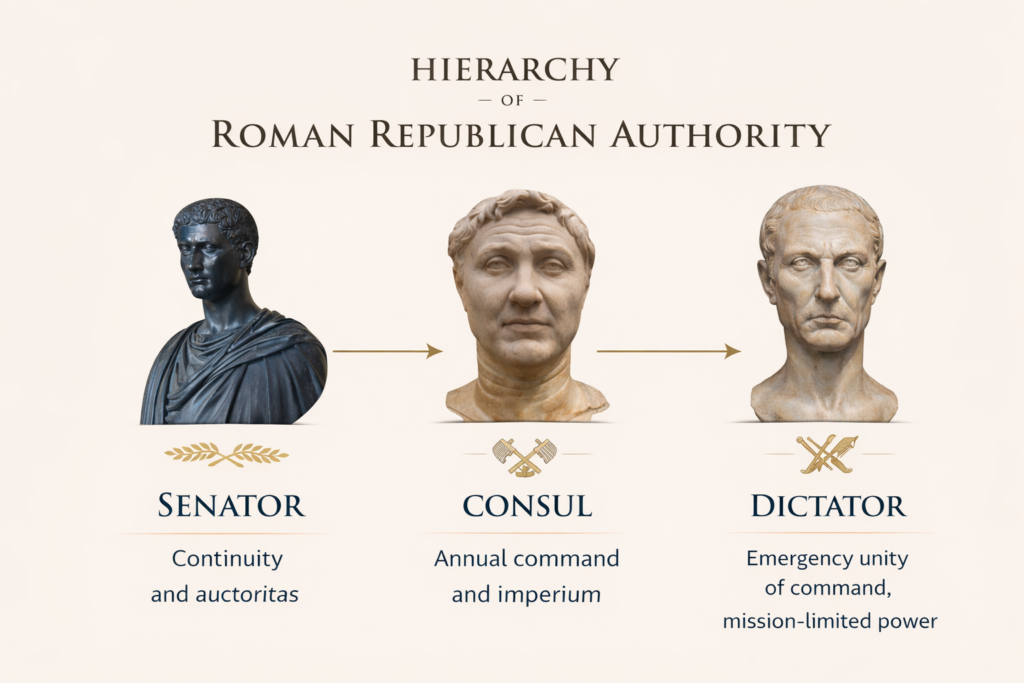 The Roman Republic did not concentrate authority in a single permanent ruler. It distributed power across offices designed to move at different speeds: consuls supplied executive force and immediate command, senators supplied continuity and collective judgment, and the dictator supplied extraordinary unity of command in moments of acute danger. The system’s stability rested on a Roman distinction that shaped political life for centuries: imperium (the legal power to command) and auctoritas (the prestige that makes counsel carry weight).