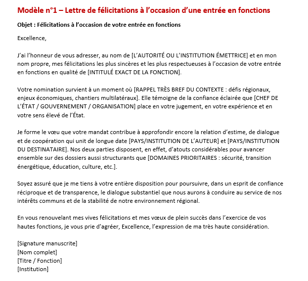 Modèle n°1 – Lettre de félicitations à l’occasion d’une entrée en fonctions