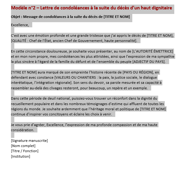 Modèle n°2 – Lettre de condoléances (haut dignitaire)