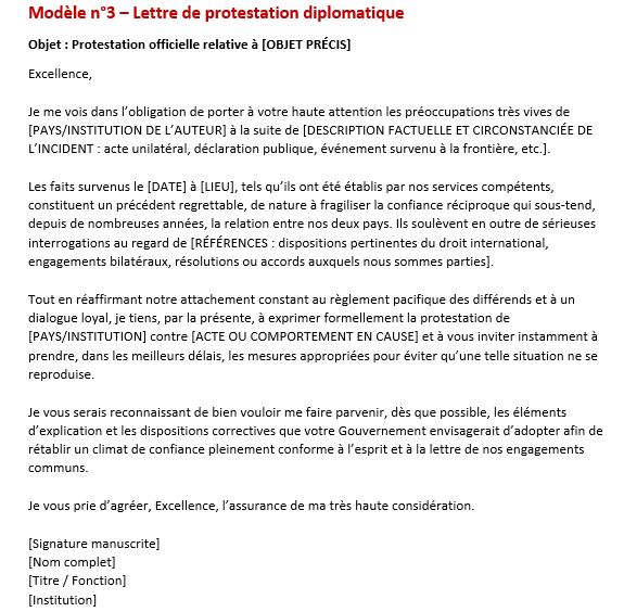 Une lettre diplomatique affirme une position ; elle ne cherche pas à briller, elle cherche à convaincre et à laisser une trace solide.