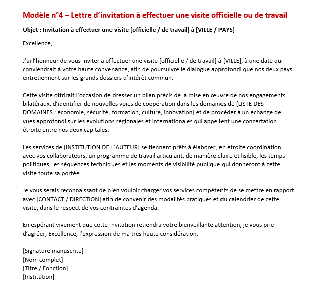 Modèle n°4 – Lettre d’invitation à une visite officielle / de travail