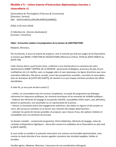 Modèle n°5 – Lettre interne d’instruction diplomatique (version « chancellerie »)