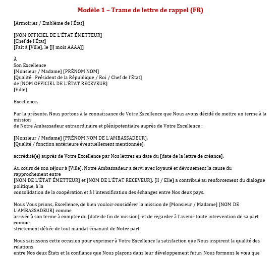 Lettre de rappel diplomatique : quand un État retire sa voix officielle + modèles Word