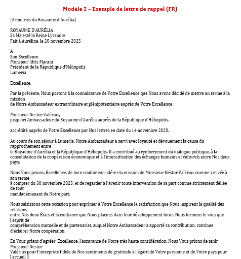 Une seule phrase suffit pour annoncer le rappel, mais elle doit être parfaitement claire. Elle mentionne la mission, le statut d’Ambassadeur extraordinaire et plénipotentiaire, et rattache la personne à ses lettres de créance initiales. - Valoriser la mission accomplie