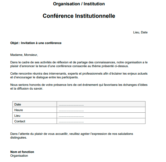Mais sa portée dépasse cette simple annonce. La lettre permet également de donner du relief à la conférence. Elle présente le thème, explique l’intention de la rencontre et montre son importance. En quelques phrases bien construites, elle peut révéler qu’un événement s’inscrit dans une réflexion plus large ou dans une dynamique de partage.