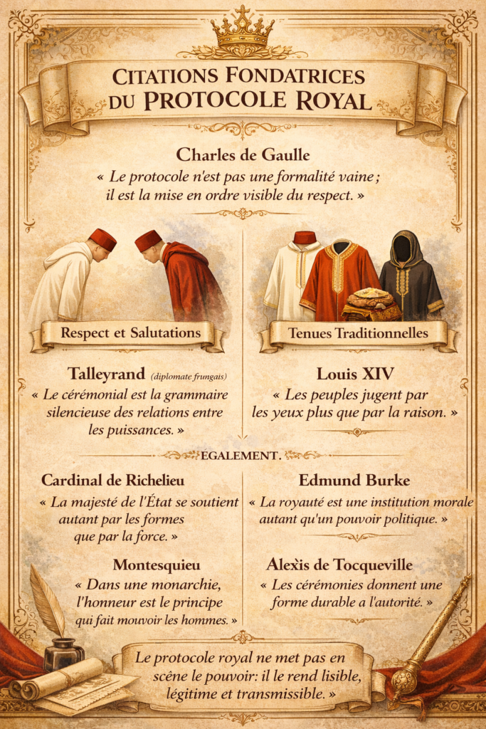 Le protocole royal apparaît alors pour ce qu’il est : une politique du signe, une architecture de la souveraineté, un art de l’État. Un art qui ordonne le visible pour préserver l’essentiel, et qui, par la rigueur de ses formes, assure à l’autorité la stabilité d’une présence historique.